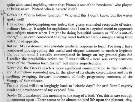 I Daybooks di Edward Weston sono una lettura che ogni persona seriamente interessata alla fotografia dovrebbe affrontare e sono, a mio parere, uno dei capolavori assoluti della letteratura diaristica. Non sono mai stati tradotti in italiano, fatta eccezione per alcune parti che riguardano soprattutto la vicenda messicana della sua relazione con Tina Modotti – non esenti, dunque, da attenzioni morbosette.